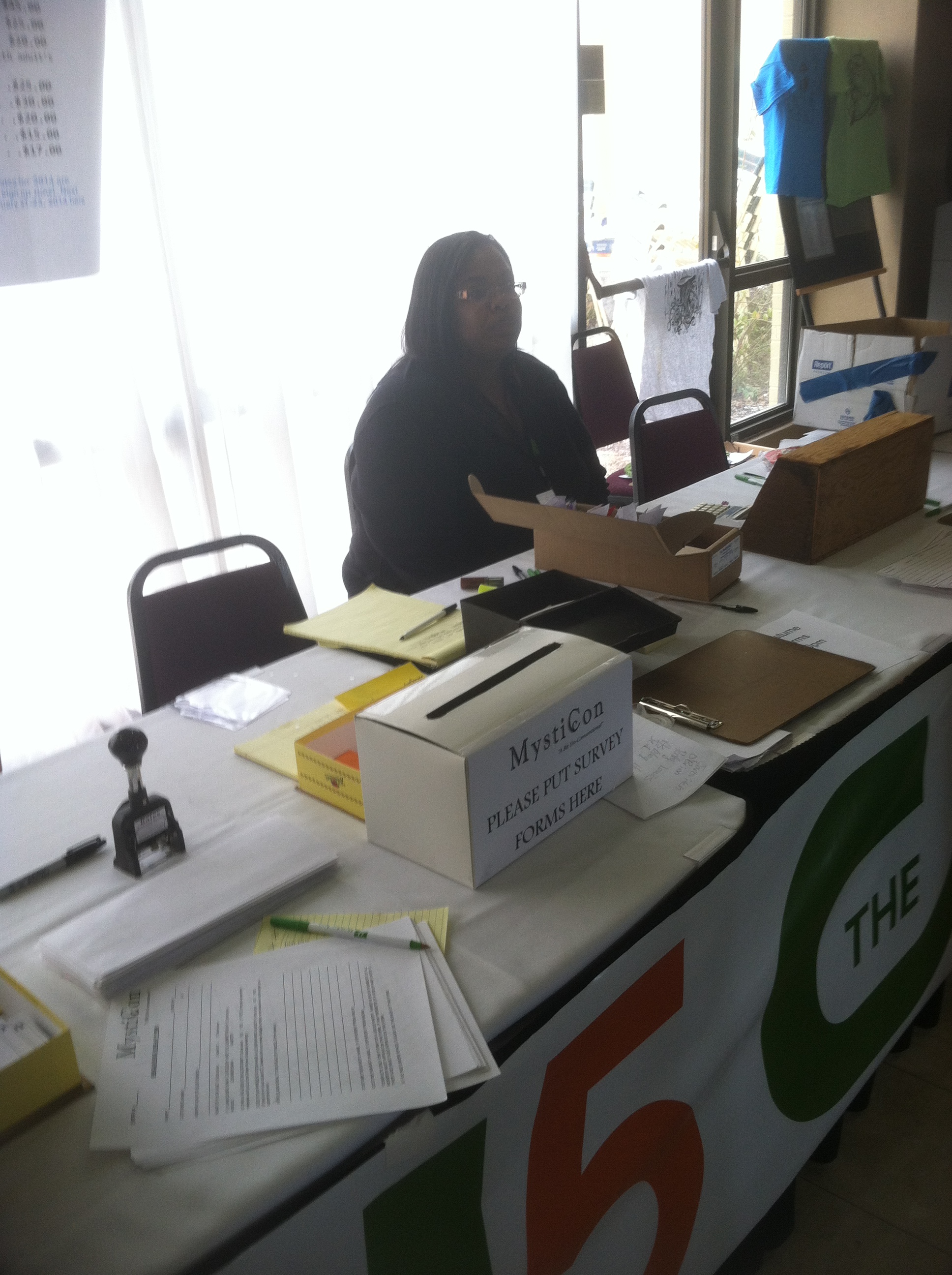 The line for attendees started here. These volunteers worked their tailfeathers off the entire weekend and really deserved a prize.