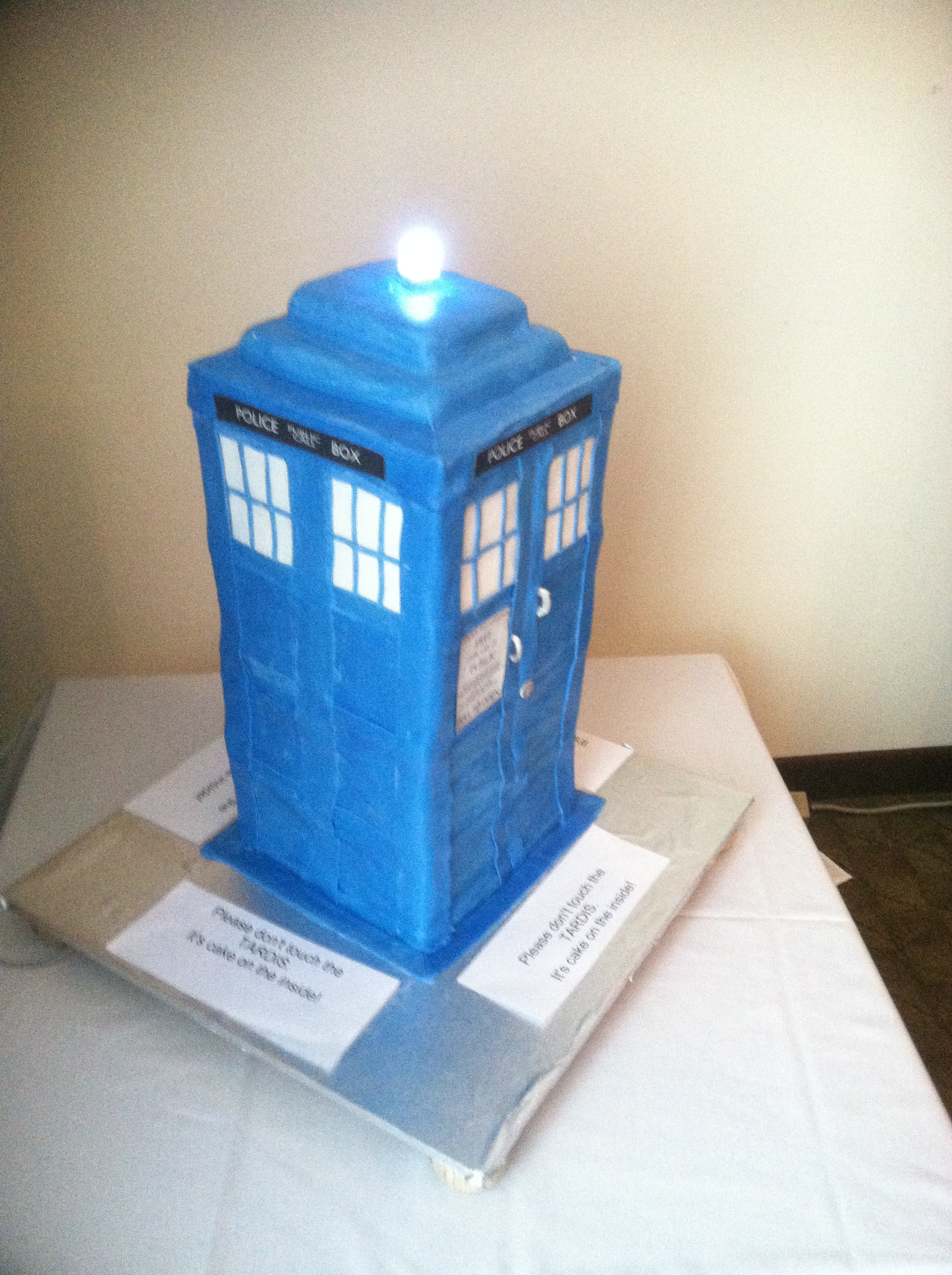 After the panel ended (thankfully, nobody was killed during the making of the panel) we headed up to the con suite. There we saw the ultimate in cake design: The TARDIS, in cake form, complete with a working light and sound effects.