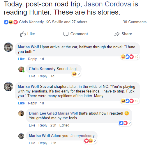 We packed up and left early, since Marisa had her flight in the evening back to Texas and they had a long drive ahead of them. On the way home I continued reading Hunter, and unbeknown to me (at first) Marisa was posting a play-by-play of my comments and noises I was making while reading. It made for some hilarious comments but eventually I was forbidden from speaking because Doc hadn’t read it yet and I was in danger of committing spoilers.