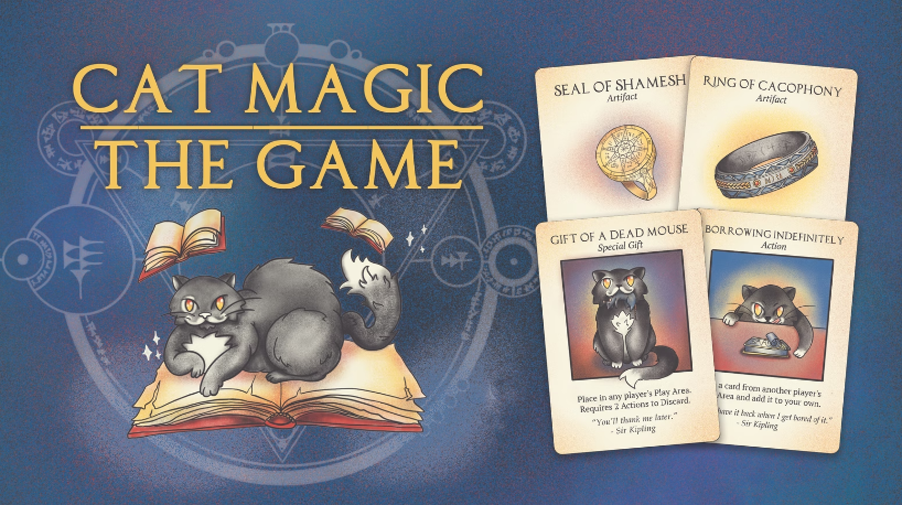 Overall notes on the game: These are taken directly from the notes I was writing while playing. One of the things we thought might be a good idea to add to the deck is a “Cat Magic Storm” card, where everyone is forced to pass their entire hands to the left (or right). Another is always fun to accuse someone of stacking the deck. It’s hard to disprove it. Like cats, it’s more fun where there are more involved. Make sure the deck is thoroughly shuffled (as mentioned above). Also, why in the rules is there the option to reveal your artifact card when you don’t have the chance to win? We tried to figure out a reason why you would reveal what you had but couldn’t come up with any other than “have to pass your turn somehow,” which makes no sense.