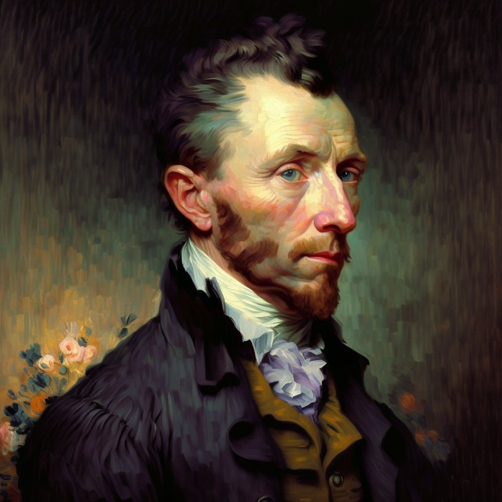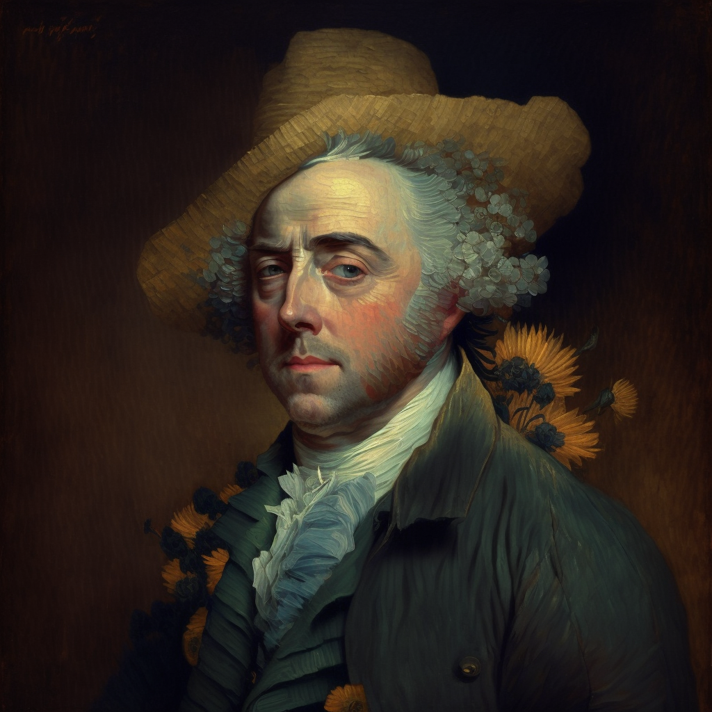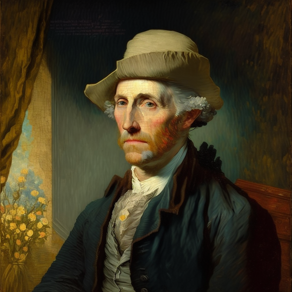 This is an interesting blend of Van Gogh’s self-portrait and the presidential portrait of James Madison. I dig the AI trying something different with the facial shadows. Hat!!!