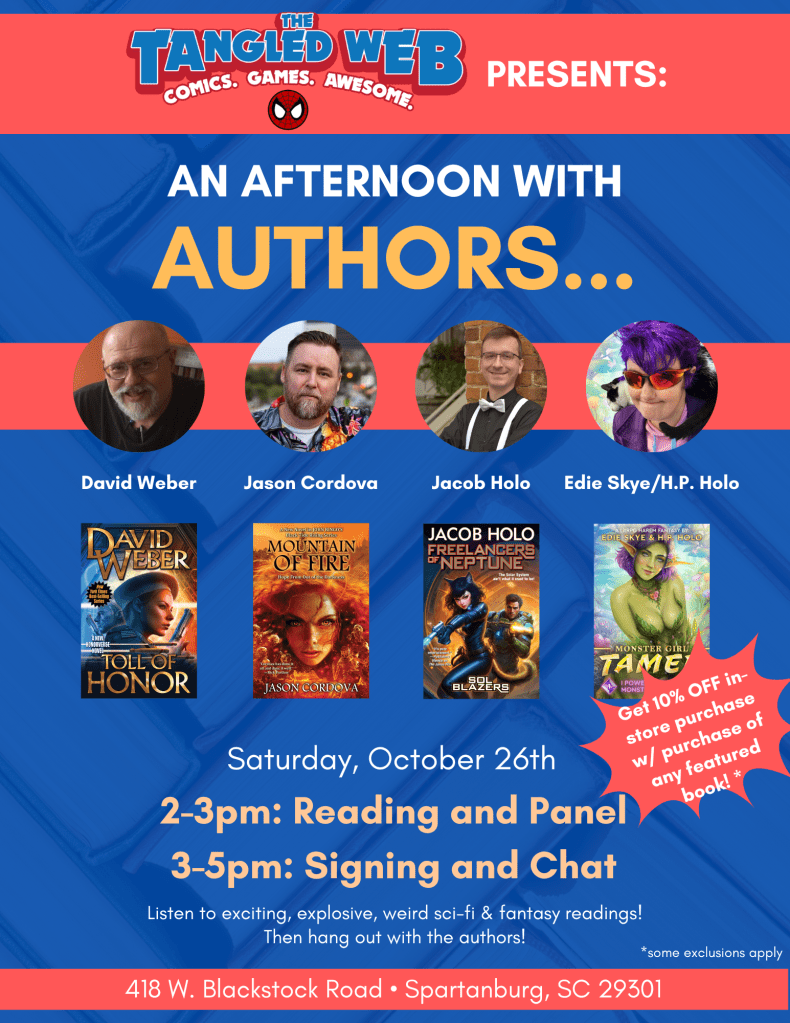 However, the signing at The Tangled Web in Spartanburg, SC on October 26 is still a probable “go.” That’s far enough out from the surgery that I’m hopeful the pain levels will be down by then. Joining me at the signing will be NYT bestselling author David Weber, and the bestselling powerhouse couple of Jacob Holo and H.P. Holo/Edie Skye. That’s going on from 2PM until roughly 5PM. There will be copies of our latest books (Rebel and The Thermopylae Protocol by David Weber, Freelancers of Neptune by Jacob Holo, and Monster Girl Tamer by Edie Skye & H.P. Holo… hey, wait a second! How…?). There also should be copies of Mountain of Fire available for purchase as well. I also have a few extra mass market paperbacks of Monster Hunter Memoirs: Fever I’ll be giving away to attendees as well. Be warned, there are limited numbers of Fever available, so it’ll be first come, first serve.